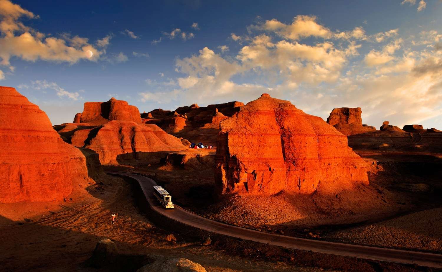 魔鬼城位于哈密市五堡鄉(xiāng)以南,距五堡鄉(xiāng)20Km,距哈密市約100Km,由于它神秘莫測,不熟悉地形的人若遇風暴,有迷失方向的危險,哈密雅丹地貌東起煙墩外的駱駝峰,經(jīng)雅滿蘇鐵礦,大南湖煤礦,到五堡沙爾湖十三間房等長約400公里,寬約5-10公里,在哈密屬于特殊的地理環(huán)境,它是經(jīng)過漫長的風蝕自然而形成的。 在魔鬼城可以看到那些酷似城堡、殿堂、佛塔、碑、人物、禽獸形態(tài)各異的景觀、令人眼花繚亂的陡壁懸崖、以及混跡巖礫中五光十色的瑪瑙、隨處可見的硅化木、枝葉清新的植物化石,偶爾可獲得象恐龍蛋化石的小圓石頭,海生的魚類化石、鳥類化石,當夜幕降臨時有時會聽到鬼哭狼嚎令人發(fā)指的嘶叫,因此才被人們稱之為“魔鬼城”。版權(quán)所有山東聊城聊之旅國際旅行社有限公司,轉(zhuǎn)載必究!其實這里還真正存在著古城堡建筑、古民房遺址―艾斯克霞爾古城堡:離地面約六米的風蝕臺上的長方形的土夯建筑有高約五米,前面有門有窗的居住地,這就是人類活動之地、是古絲路的驛站或是哈密王朝的西南前哨,據(jù)當?shù)厝送茰y,此地西面的沙爾湖(由流沙通向羅布泊)干涸之前,這里也有村莊人家,當水源游移(地殼變化)沙爾湖消失后,林木飛鳥在風沙中,部分變?yōu)榛说鼐幼〉娜酥坏帽尘x鄉(xiāng),連先祖的遺骨也移走了、至今僅有遺址。哈密魔鬼城已是國家AAAA級景區(qū)。