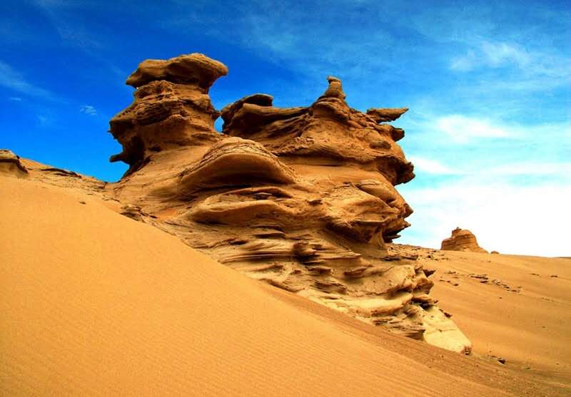 1.2萬年以來的全新世,在洪流和強風的作用下原來平坦的盆地被慢慢沖刷剝蝕。風和流水可以帶走疏松的沙土層,對堅硬的泥巖層和石膏膠結(jié)層卻作用有限。版權(quán)所有山東聊城聊之旅國際旅行社有限公司,轉(zhuǎn)載必究!不過致密的泥巖層也并非堅不可摧,荒漠區(qū)變化劇烈的溫差產(chǎn)生的脹縮效應(yīng)導(dǎo)致泥巖層最終發(fā)生崩裂,暴露出來的沙土層被風和流水帶走,演變?yōu)榘疾蹱?;依然有泥巖層覆蓋的部分相對穩(wěn)固,形成或大或小的長條形土墩,這種奇特的地貌形態(tài)逐漸凸現(xiàn)出來。