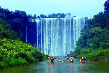 竹筏穿瀑云霧溫卷,彩虹生輝,在陽光的照射下,瀑霧處處成虹。隨陽光強(qiáng)弱,觀賞角度的變化而變化。游客乘坐竹船漂流于湖面之上,觀瀑觀景便能達(dá)到只身如畫不是夢的境界。