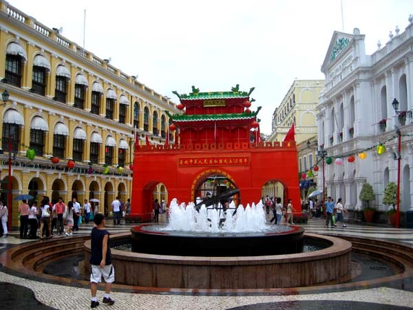 在50至70年代中旬,澳門的親北京團(tuán)體在每年十月于議事亭前地(或附近一帶如星光書店舊址、郵政局旁)豎立由跨前地之木制紅色牌樓,與市政廳大樓相對,慶祝過后便拆卸,印證著澳門當(dāng)時政治對立的局面。牌樓通常高三層,與附近建筑物高度幾乎相同,彷照天安門樣式布置,上面有澳門同胞慶祝國慶字樣,落地注中有當(dāng)時之政治標(biāo)語,上有大型繪畫,每年主題不一,晚上亮燈或燃放鞭炮以示慶祝。
