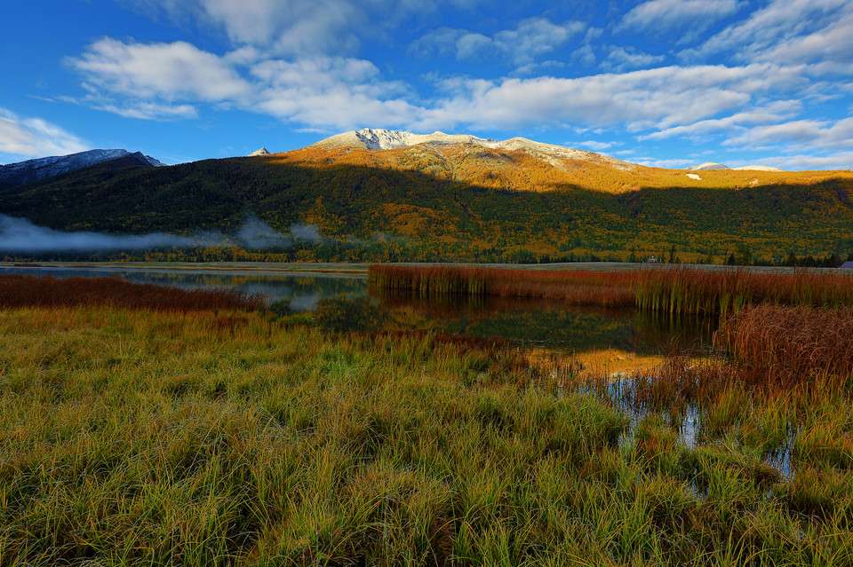 鴨澤湖位于禾木喀納斯蒙古族鄉(xiāng)境內喀納斯村南邊,它是由喀納斯河改道后廢棄河段——牛軛湖洼地組成,呈長形蝶狀,沿洼地南端形成一個南北走向的寬淺湖泊,形似蝶狀的一弘碧水與沼澤濕地連為一體,面積約1.3 平方公里。
