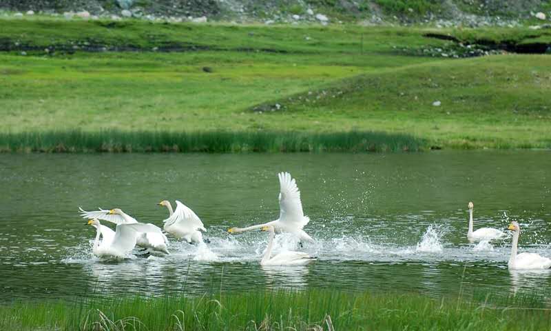 湖水與周圍開闊的沼澤濕地和河谷草原上,棲息著種類繁多的禽鳥,成群的野鴨、大雁和天鵝等時常