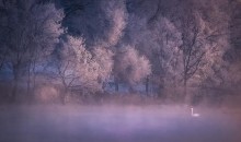 深秋時節(jié)是月亮灣色彩最豐富景色最迷人的時候。山頂?shù)难┖涂~緲的霧是白色,山腰的西伯利亞落葉松和白樺樹的葉是金黃色,間雜其中的冷杉和云杉翠綠色,河水是翡翠色,九月底的月亮灣還有楓樹的紅葉映襯,簡直就是上帝的調(diào)色板。