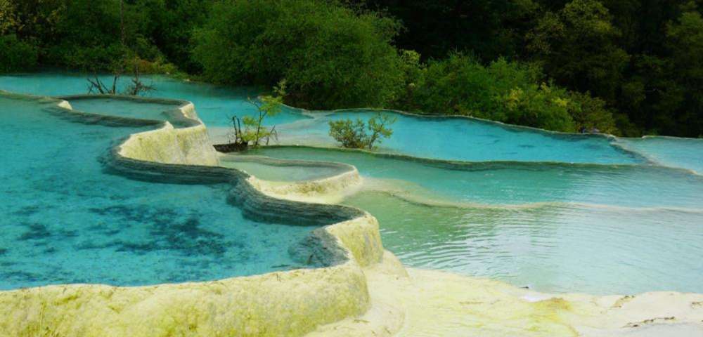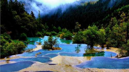這一片景觀,還有緊傍森林的明鏡倒影池、掩映于杜鵑花叢間的婆蘿彩池和擁有彩池500多個(gè),鈣化景觀中色彩最為豐富的爭(zhēng)艷池。