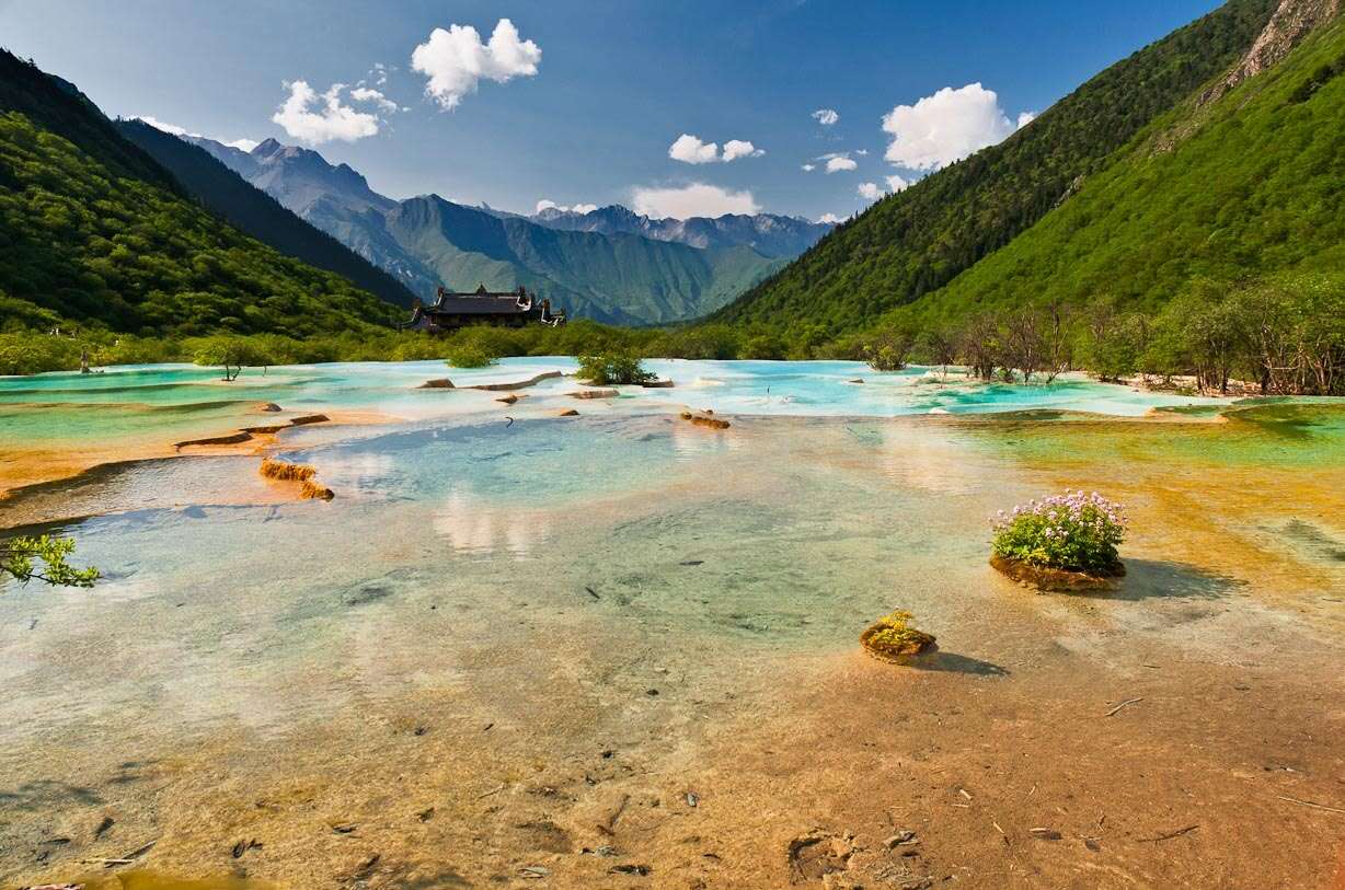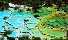 進(jìn)入黃龍景區(qū),首先看到的是一組精巧別致、水質(zhì)明麗的池群--迎賓池。池子大小不一,形狀奇特,色彩艷麗,錯(cuò)落有致,四周山岳環(huán)峙,林木蔥蘢,山間野花競(jìng)放,彩蝶飛舞。山間石徑曲折盤旋,點(diǎn)綴著觀景亭閣,倍添情趣。