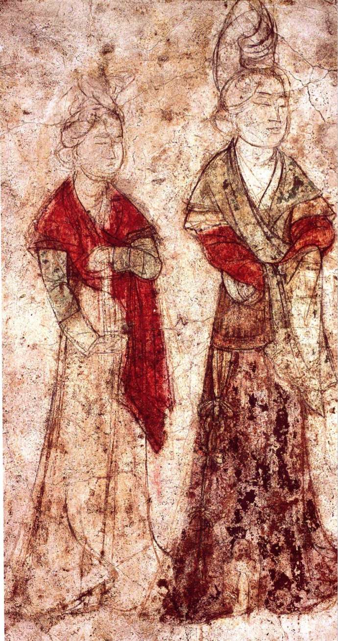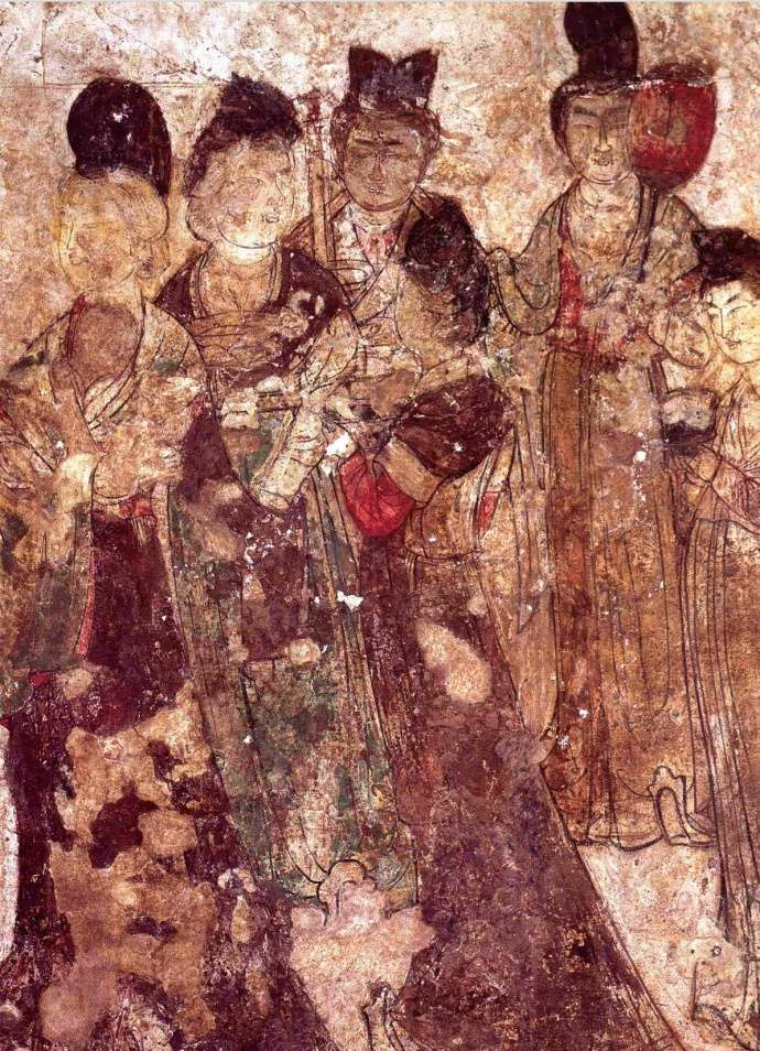 前墓室長4.54米,寬4.45米,高6.3米。東、西壁略呈弧形,頂為穹隆頂,頂懸掛油燈的鐵鉤一個。四壁有壁畫。東壁兩組壁畫,一組畫宮女六人;頭一人為領(lǐng)隊,分別手托蠟燭、持包袱。另一組畫宮女七人:頭一人為領(lǐng)隊,分別手托盤、瓶、蠟燭、杯、團扇等。西壁畫二組宮女14人。頂繪天體,東是金烏(太陽),西是玉兔(月亮),深灰色的天空,白色星點密布在銀河的兩邊。