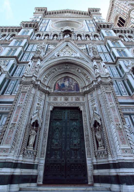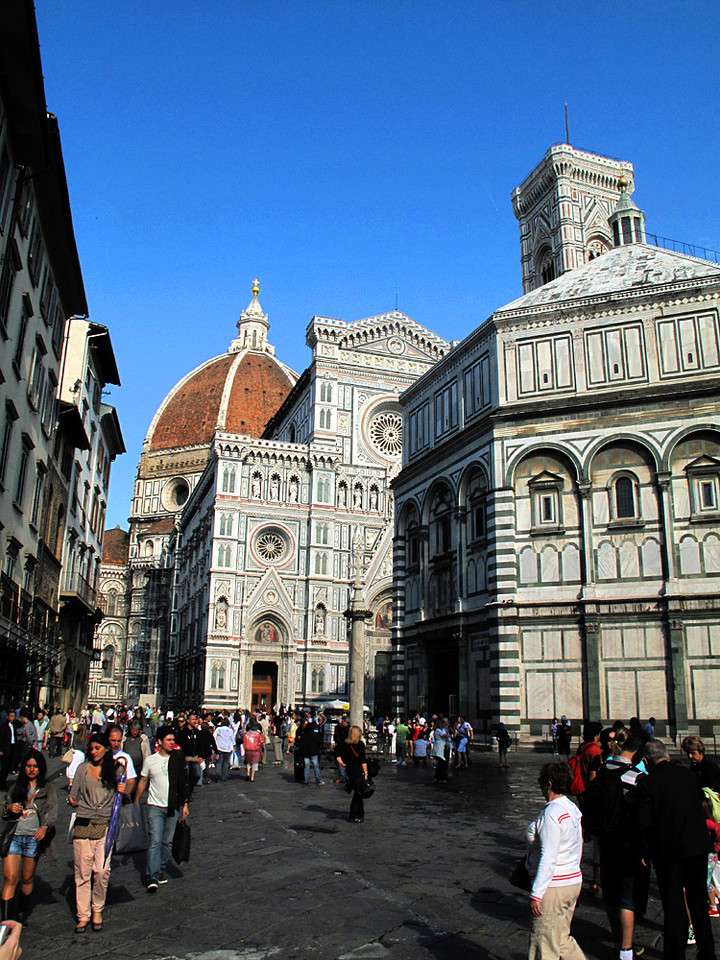 佛羅倫薩最著名的一組建筑——花之圣母大教堂(主教堂Basilica)、洗禮堂和鐘塔被緊緊包圍在Duomo廣場中心,人們要一直走進廣場,抬起頭來,才能看清主教堂的立面。廣場和周圍的街道,密密排著各色店鋪,人來人往,非常繁華。這組建筑群不像比薩 Pisa 的那樣仿佛是專門供人欣賞的陳列品,而是興高采烈地擠在市民日常生活的漩渦之中。