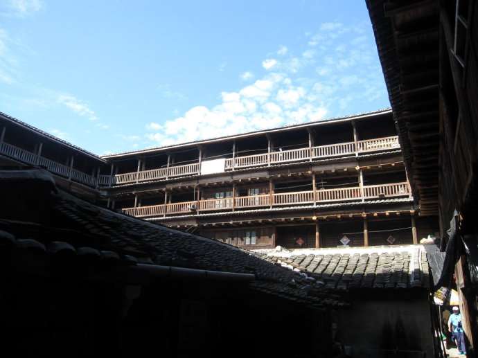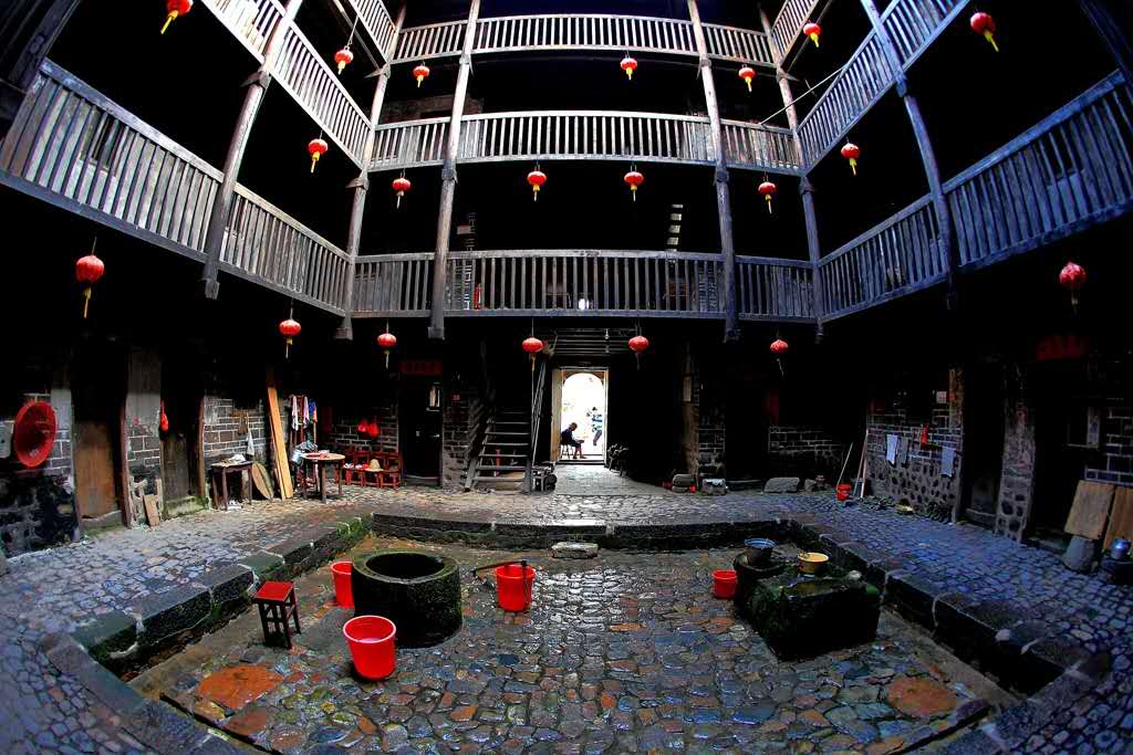 亦有五鳳型,橢圓型,八卦型,永定最多,將近二萬多座。南靖亦有一萬五千多座。永定以客家人為主,南靖為閩南人.土樓內(nèi)有水井和排水,門大多只有一個,多的有3個。房間的窗戶較小。遠處看去就是一個堡壘。門比較結(jié)實,大多包了鐵皮,晚上大門一關(guān),非常安全。土樓的中間是祠堂,祠堂有的是獨立的。