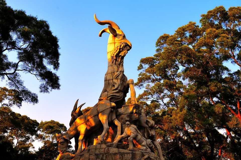“五羊石像”由130多塊花崗巖雕刻組砌而成,高11米,體積53立方米。五只石羊神態(tài)各異:站在高處的老羊雄勁,口銜谷穗,昂首向前方;老羊腳下是一對(duì)親密依偎的小羊;再有一對(duì)母子羊,母羊左右回首顧盼正在安靜吸乳的幼羊,幼羊則跪在母羊下吸乳,深厚母愛(ài)溢于言表。