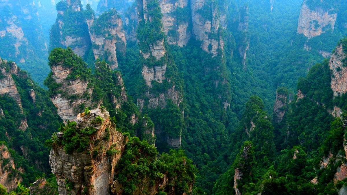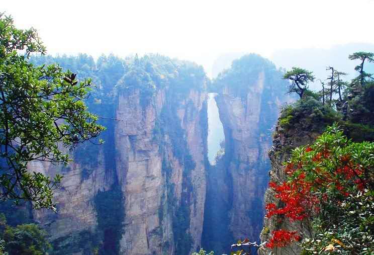 當您在崖間翠竹叢林中向下穿行時,突然被一面石壁擋住去路。正疑無路,卻見絕壁上拐彎處,洞開一滿月狀白石。穿門而過,眼前突現(xiàn)數(shù)十座奇峰參差聳立于墨綠深澗之中。但見石峰攢簇,澗水縈回,古木參天,蓋天鋪地。登高俯瞰,似天然盆景。石峰成百上千,高的入云,矮的臥地,大起大落,相映生輝。在袁家界景區(qū),既有石叢小澗、銀瀑高瀉,又有竹林繁茂、蒼松垂壁。由于水豐林密,空氣極為清新。最新測定顯示,袁家界景區(qū)森林覆蓋率高達98%以上,空氣中的含塵量和含菌量特別少,而含氧量很高,某些地段每立方米空氣中的負氧離子數(shù)目近10萬個,比通常環(huán)境高出500倍左右,儼然是一個巨大的“天然氧吧”,非常適宜休閑養(yǎng)生。過去,袁家界因地勢險要,周邊交通極為不便,故長期鮮為人知。隨著世界第一梯——百龍?zhí)焯莸慕ǔ砷_通,解決了多年困擾景區(qū)的交通瓶頸問題,袁家界景區(qū)才得以深度開發(fā),許多人跡罕至的地方變成了萬眾矚目的旅游景點,有張家界“后花園”之稱的袁家界美景也得以從幕后走到了臺前。