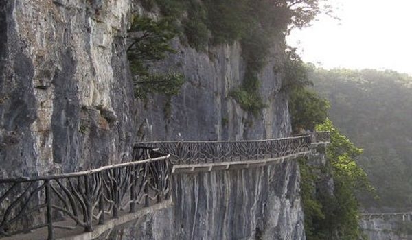 據(jù)施工人員介紹,此條棧道也是他們所修棧道中施工最難,最險(xiǎn)峻的一條。如果您還覺(jué)得不夠刺激的話,在棧道的完結(jié)處的兩個(gè)懸崖之間有一條長(zhǎng)160米的懸索吊橋,同時(shí),在海拔最高點(diǎn)還有一個(gè)挑戰(zhàn)心里極限的玻璃站臺(tái),在這里,如果你能挺直腰板伸開(kāi)雙臂,那么,您就是真正的勇士了。