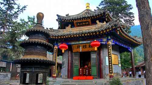 殿內(nèi)供奉著集五座臺(tái)頂五種文殊法像于一室的五方文殊銅像,高約2米,從南到北依次為:東臺(tái)聰明文殊,北臺(tái)無垢文殊。