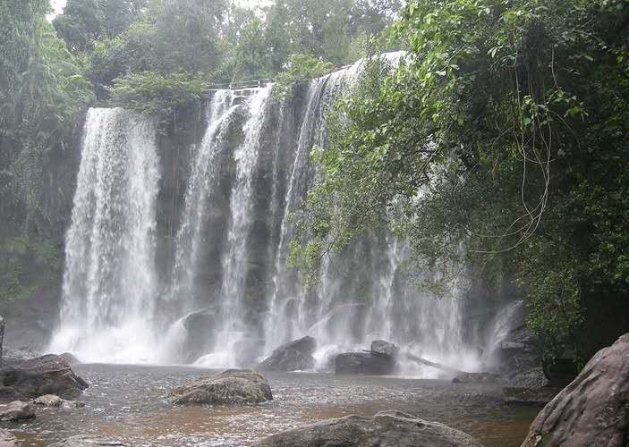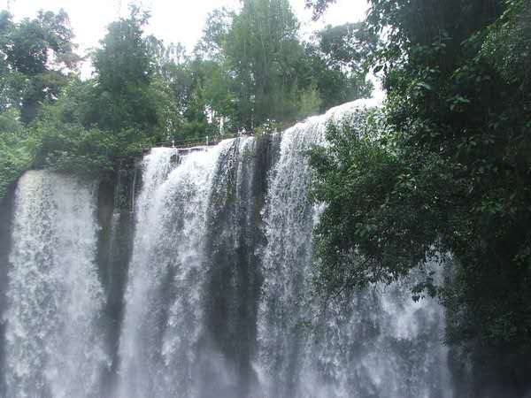 在波列昂通寺西南有一著名瀑布,叫荔枝山瀑布,位于暹粒河上游的一個開闊山谷,山谷左右有茂林修竹夾峙。水簾似的大瀑布沿石壁傾瀉而下,勢如萬馬奔騰。版權(quán)所有山東聊城聊之旅國際旅行社有限公司,轉(zhuǎn)載必究!瀑布分為兩節(jié),第一節(jié)約 25 米高,沿著石壁傾注在一塊約1000 平方米的平臺上。瀑水流過平臺,到了一垛落差約 30 米高的絕崖峭壁上部,從這里再沖出峭崖,砰然跌落,又形成寬達(dá) 100 米的瀑布,響聲雷鳴,水花四濺,景色極為壯觀。平臺上分布著 16 個深淺不同的天然石洞,洞底有一層薄薄的黃沙,游人可以在洞中用瀑水洗澡。
