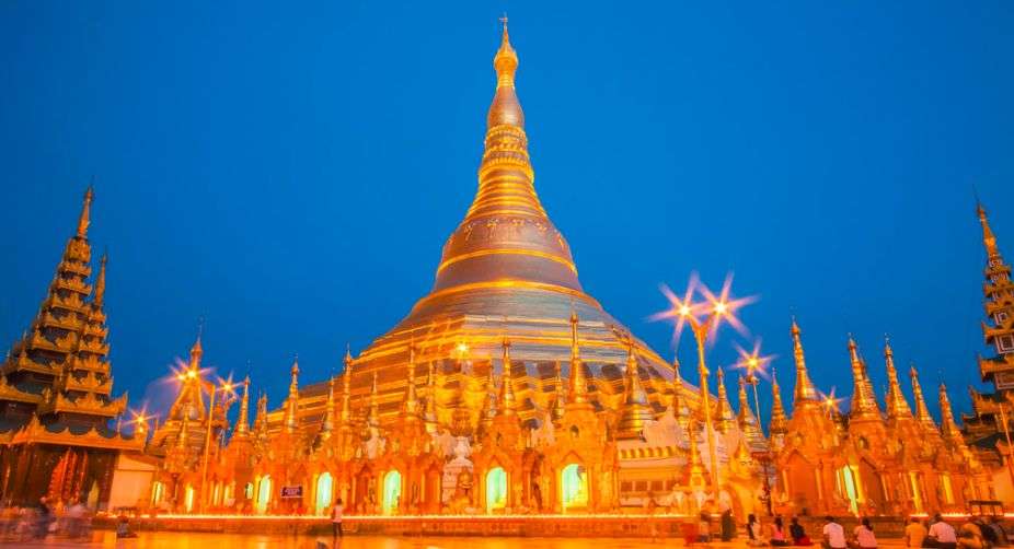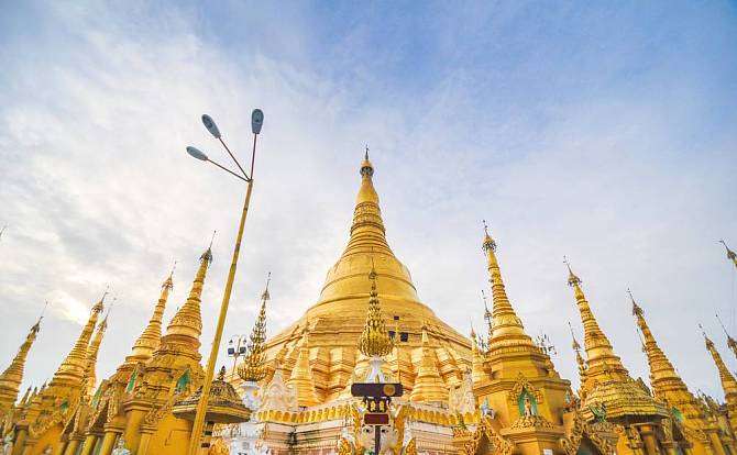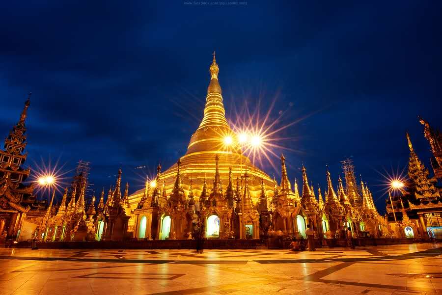 其高度為98米,表面則鋪上了一層金,再加上它是位于皇家圓林西的圣山(Singuttara)之上,所以這座塔也就在仰光市天際線中獨占鰲頭了。它是緬甸中最神圣的佛塔,因為它供奉了四位佛陀的遺物,包括是拘留孫佛(Kakusandha)的杖,正等覺金寂佛(Konagamana)的凈水器,迦葉佛(Kassapa)的袍及佛祖釋迦牟尼的八根頭發(fā)。全塔上下通體貼金,加上4座中塔、64座小塔,共用黃金7噸多!在塔頂?shù)慕饌闵?,還掛有1065個金鈴、420個銀鈴,上端以純金箔貼面,頂端鑲有5448顆鉆石和2000顆寶石。