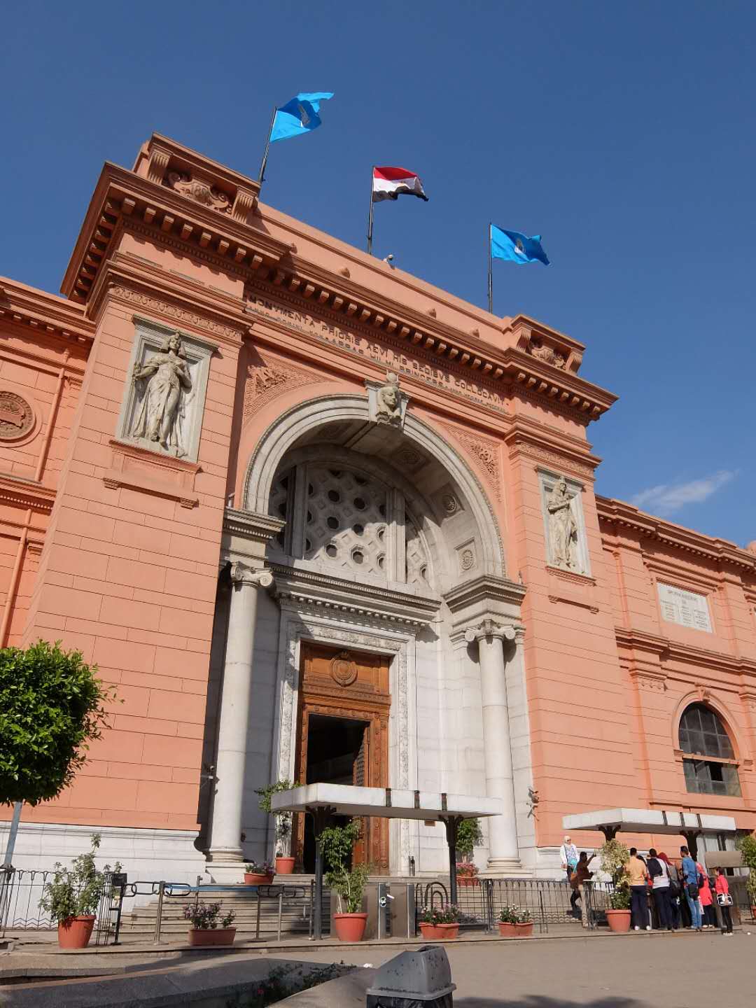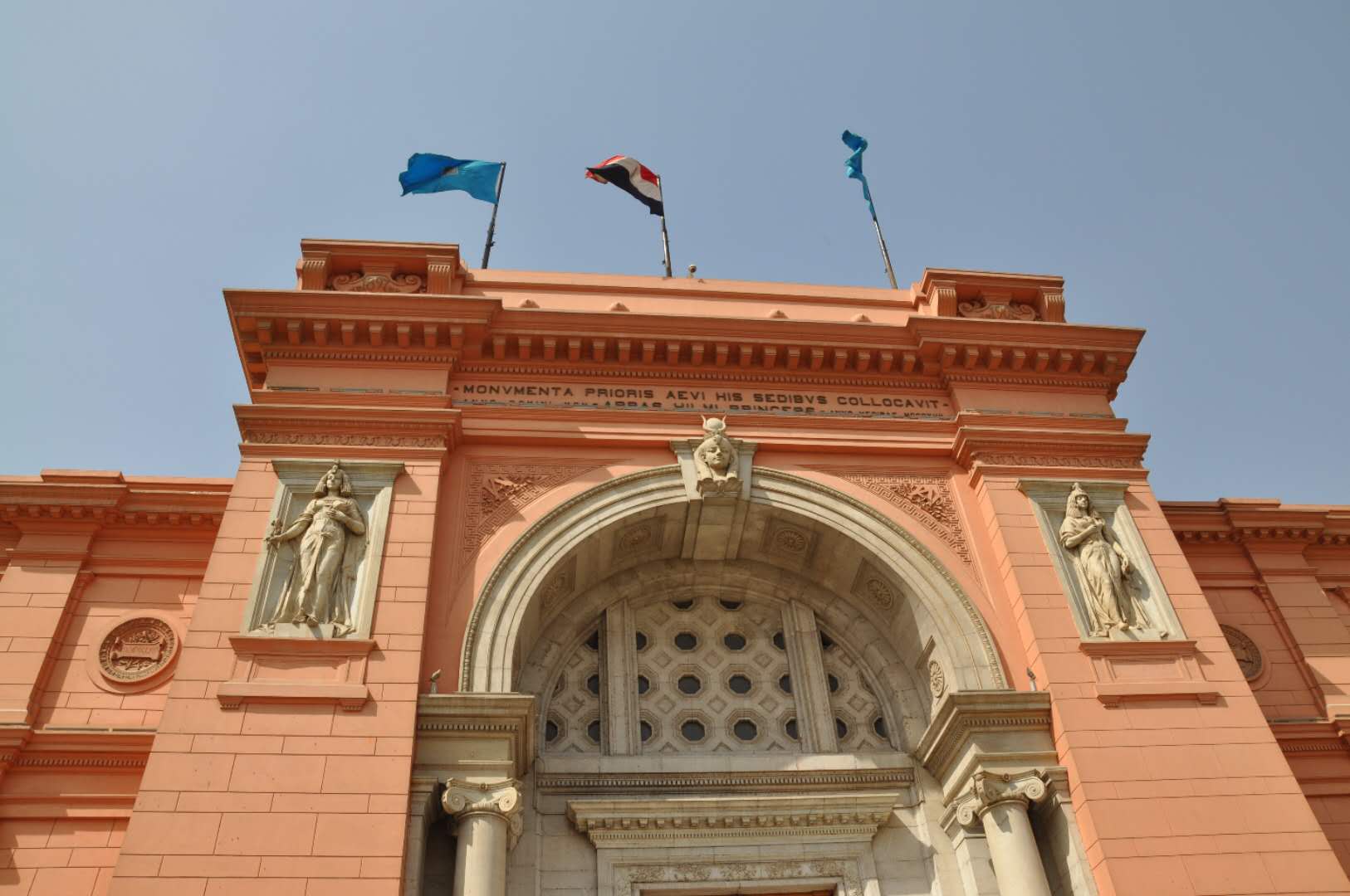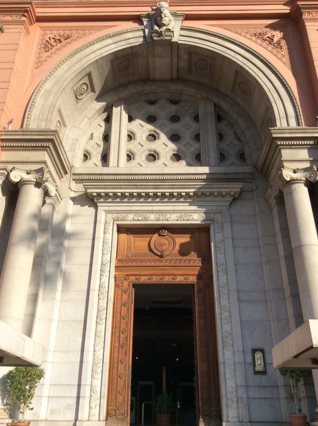 博物館入口的設(shè)計(jì)融入了古埃及藝術(shù)的特征:大門(mén)的外廓是一個(gè)圓形拱門(mén),拱門(mén)兩側(cè)的壁龕中各有一個(gè)將法老形象歐式化的浮雕,其中一個(gè)持有紙莎草,另一個(gè)持有蓮花,分別象征古代埃及的南北方。