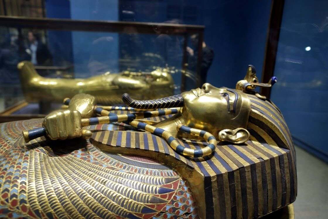 第18代法老王朝圖坦卡蒙陵墓中出土的1700余件文物,其中有金質(zhì)御座、黃金面具、黃金棺、黃金飾物,圖坦卡蒙及王后的精美淺浮雕像,法老的輦車(chē),兵車(chē)和狩獵用彎弓,鑲嵌象牙和彩色玻璃的家具,王后的珠寶首飾和衣箱等。
