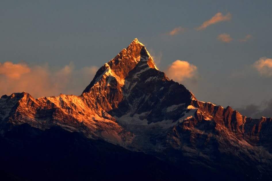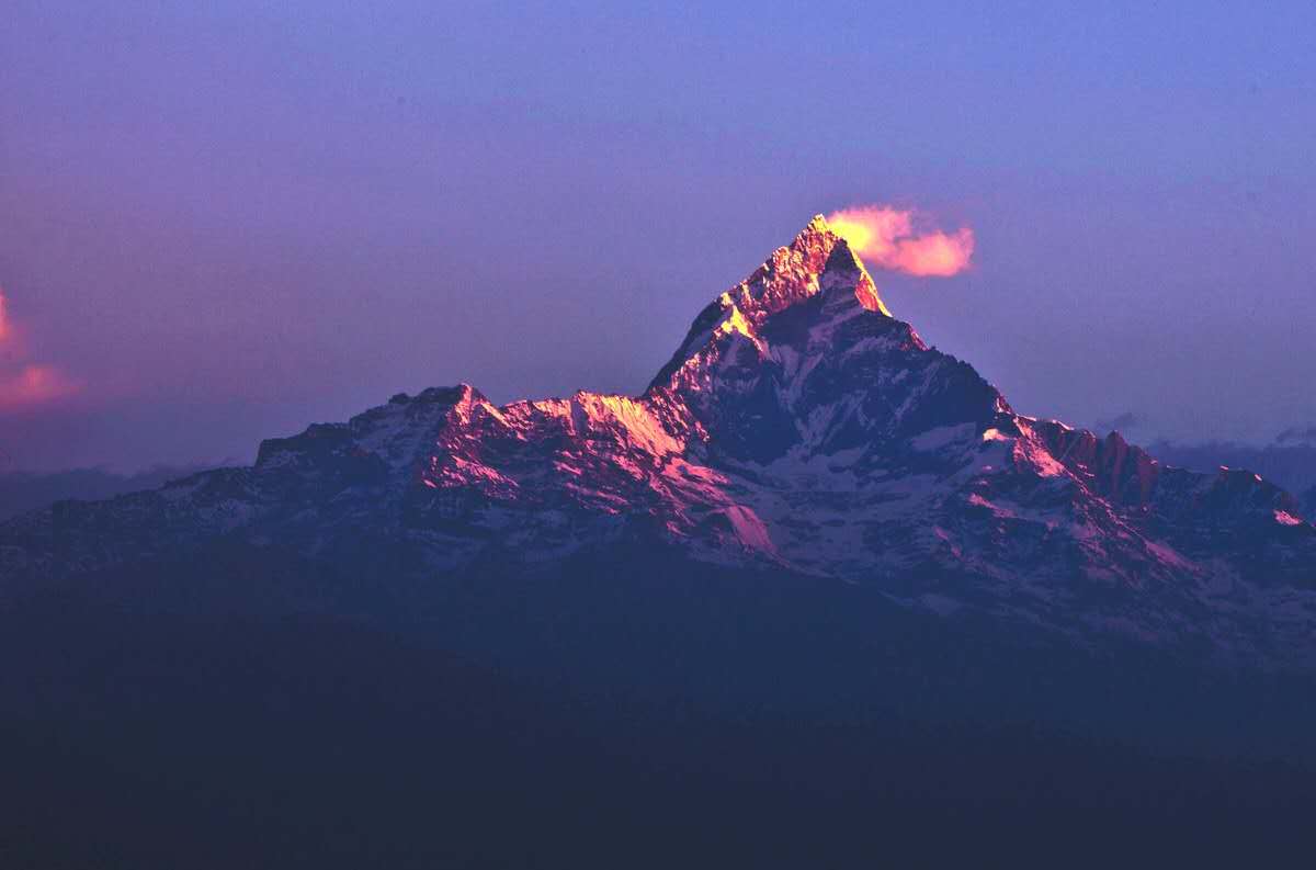 魚尾峰雖然不是尼泊爾最高的山峰,但卻成為尼泊爾的標(biāo)志。從波卡拉的費(fèi)娃湖附近,可以看到這座圣山和周圍峰群,突出于較低的山巒之上。