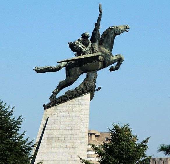 朝鮮千里馬銅像矗立在萬(wàn)壽臺(tái)的丘崗上,是1961年4月 15日,在偉大領(lǐng)袖金日成同志的49壽辰之際建立的。座基是用360多種2,500多塊不同規(guī)格的花崗巖壘起來(lái)的,銅像為一匹伸展雙翅的騎有工人、農(nóng)民的 “千里馬”。