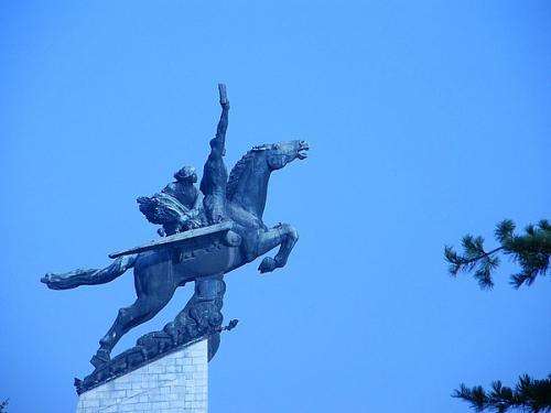 朝鮮千里馬銅像矗立在萬(wàn)壽臺(tái)的丘崗上,是1961年4月 15日,在偉大領(lǐng)袖金日成同志的49壽辰之際建立的。