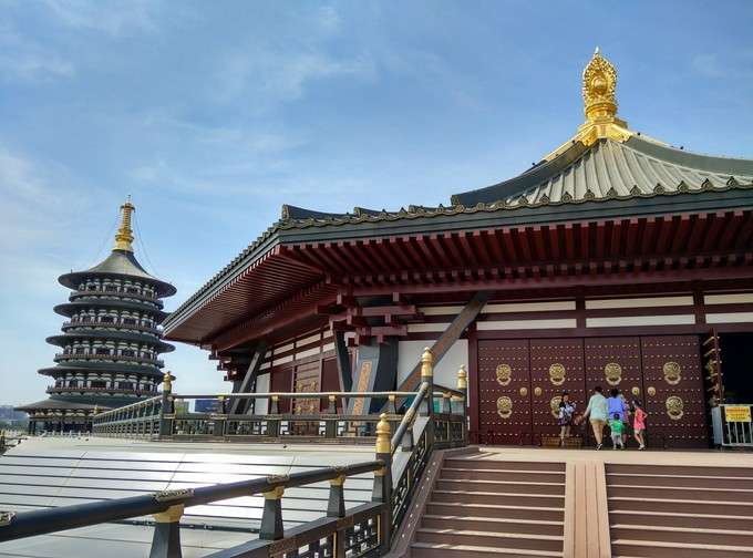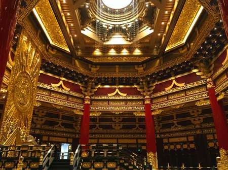 共三層,底層為四方形,四面各施一色,分別代表春夏秋冬四季。中層十二面效法一天中十二個(gè)時(shí)辰。頂層為圓形,四周環(huán)繞九龍雕塑。中間有周長十五米左右的巨型木柱,上下通貫,故此又名為萬象神宮。其建筑技術(shù)和施工技術(shù)驚世駭俗。