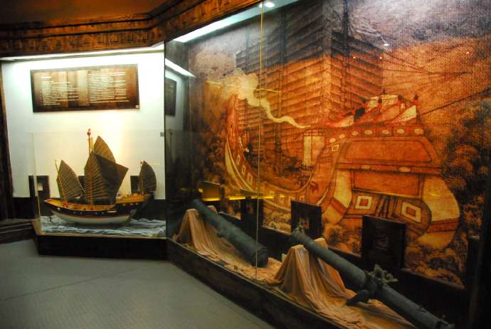 在陳列櫥里,有鄭成功佩帶的玉帶、龍袍殘片、鞋子、圖章等遺物。在詩(shī)畫資料中,有鄭成功的詩(shī)作及其手書、《鄭成功與王忠孝對(duì)奕圖》、《海上見聞錄定本》、延平王戶官楊英的《先王實(shí)錄》以及《稗海紀(jì)游》等,其中《海上見聞錄定本》(共兩冊(cè))是1960年在同安發(fā)現(xiàn)的一部抄本,是非常珍貴的歷史資料。此外,還有雙龍銅炮,以炮身飾有兩條游龍而命名的。