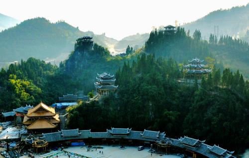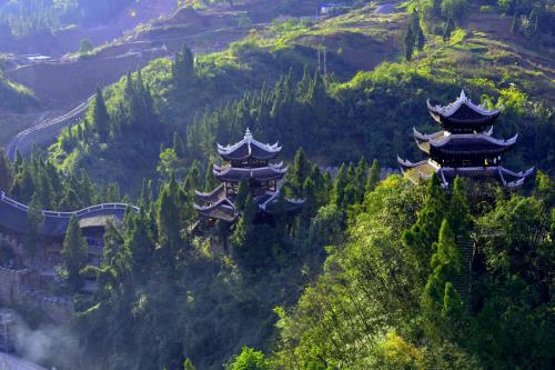 蚩尤九黎城位于重慶市彭水縣紹慶街道與靛水街道結(jié)合部的亭子壩,東經(jīng)摩圍山隧道與彭水老城區(qū)相連,南接彭水新城,北至烏江并與湘渝高速下線互通。