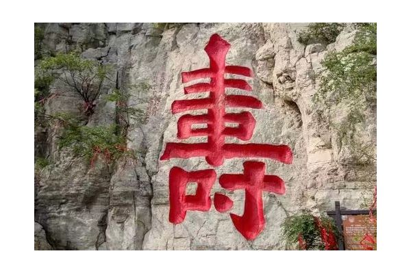 山陰處海內(nèi)外罕見的巨大鐫刻"壽"字是“壽比南山”典故的出處,該字結(jié)構(gòu)嚴(yán)謹(jǐn),端莊大方,坐南朝北,通高7.5米,寬3.7米,單是下部的"寸"字就高2.22米,為大個頭的漢子所不及,故當(dāng)?shù)赜?壽比南山"、"人無寸高"之說。這個"壽"字是明嘉靖年間衡王府內(nèi)掌司冀陽周全所獻(xiàn)書。端詳此"壽",字體揮灑俊逸,筆劃圓泣流暢,雖千鑿百斧雕成,卻不露分毫痕跡,充分體現(xiàn)了勞動人民的聰明智慧,是書法石刻藝術(shù)的瑰寶。自此,青州官民,朝野上下,去云門山拜壽的人絡(luò)繹不絕,已有400余年的歷史了。眾從的中外游客都把能到云門山參拜大壽字作為自己最大的心愿。