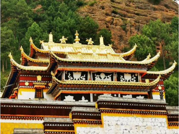 館為院落式佛殿建筑群,由十三余座建筑組成——大雄寶殿巍峨壯麗;藏經(jīng)閣、度母殿精致典雅;瑪哈噶拉殿、祈壽殿、財(cái)神殿、大講堂莊嚴(yán)肅穆;陽(yáng)光精舍、噶當(dāng)精舍、上師寢宮、夏爾倉(cāng)和賽赤活佛寢宮明柱素潔,另有藏地罕見(jiàn)的關(guān)公殿奉立其中。
