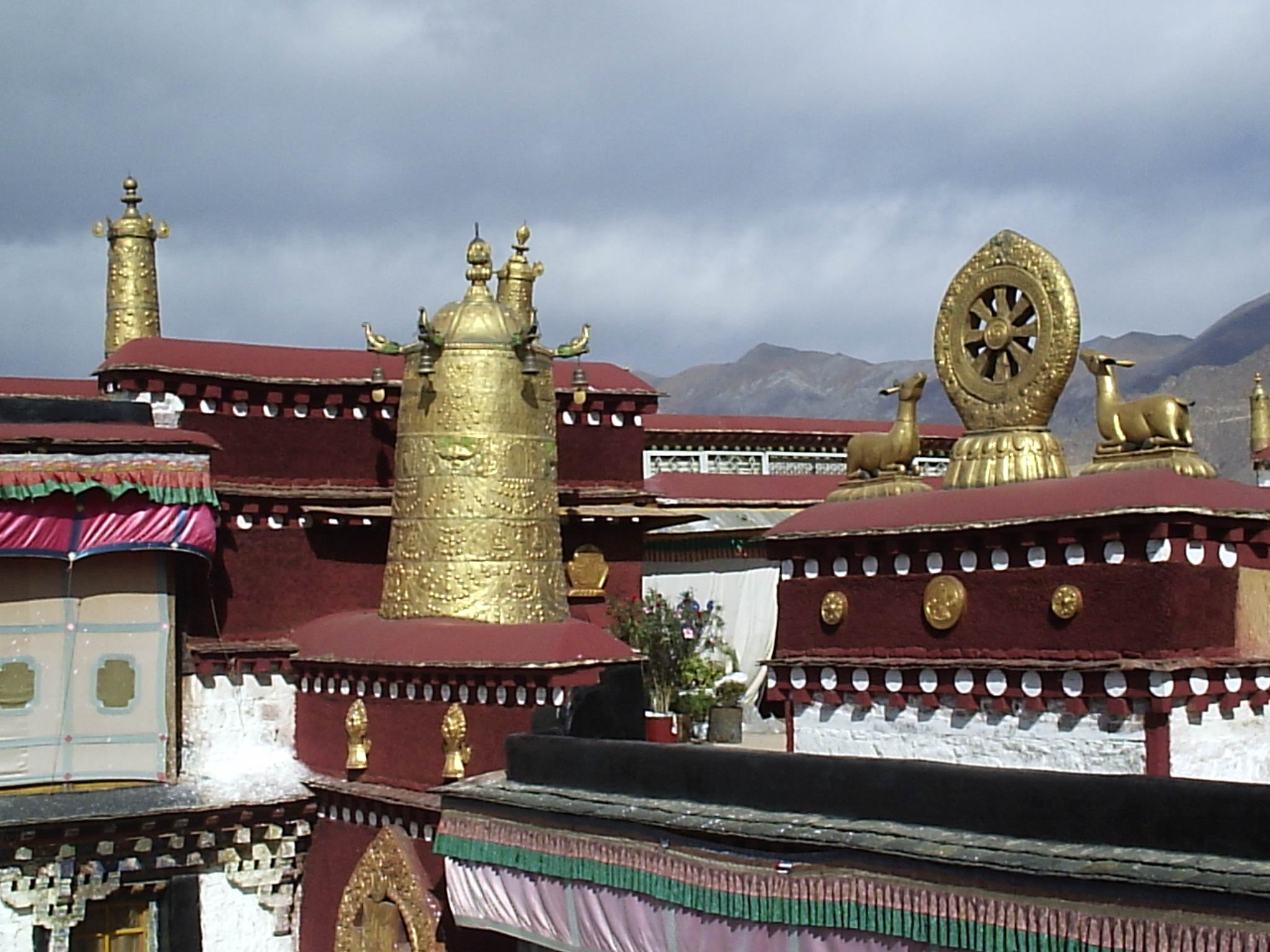 從大昭寺金頂俯瞰大昭寺廣場,右邊遠處山上是布達拉宮,近處的柳樹是“公主柳”,相傳是文成公主所栽。大昭寺的布局方位與漢地佛教的寺院不同,其主殿是坐東面西的。主殿高四層,兩側列有配殿,布局結構上再現(xiàn)了佛教中曼陀羅壇城的宇宙理想模式。寺院內(nèi)的佛殿主要有釋迦牟尼殿、宗喀巴大師殿、松贊干布殿、班旦拉姆殿(格魯派的護法神)、神羊熱姆杰姆殿、藏王殿等等。寺內(nèi)各種木雕、壁畫精美絕倫,空氣中彌漫著酥油香氣,藏民們神情虔誠地參拜轉經(jīng)。