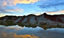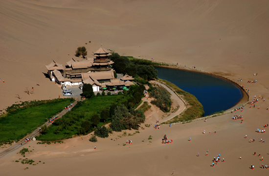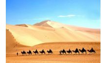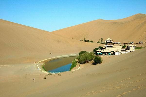 鳴沙山位距敦煌市南郊5公里,因沙動(dòng)成響而得名。山為流沙積成,分紅、黃、綠、白、黑五色。漢稱沙角山,又名神沙山,魏晉時(shí)始稱鳴沙山。其山東西綿亙40余公里,南北寬約20余公里,沙壟相銜,盤桓回環(huán)。其特點(diǎn):“峰巒陡峭,山脊如刃;馬踐人馳,殷殷有聲;輕若絲竹,重如雷鳴;沙隨足落,經(jīng)宿復(fù)初?!?/p>