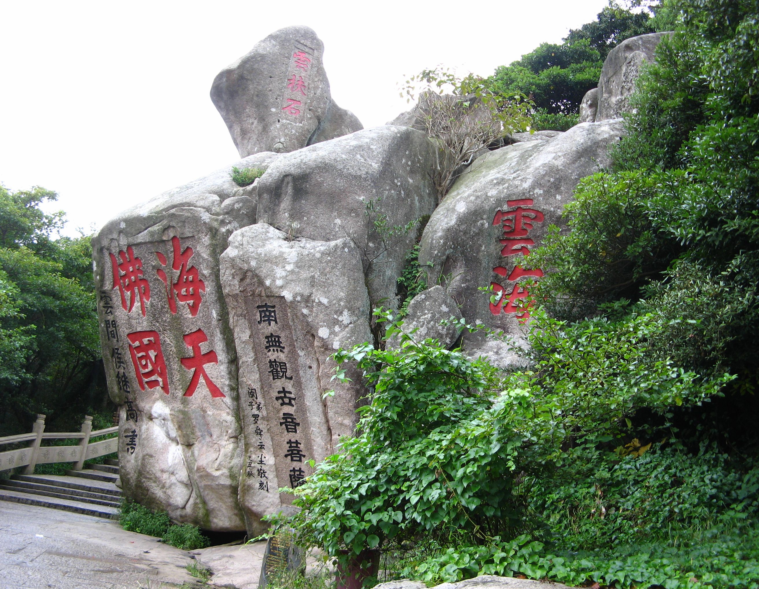 海天佛國(guó)石位于香云路盡頭處,路側(cè)有一石大如屋,斜置若撲,上鐫“海天佛國(guó)”大字,今已成為普陀山之代稱。巖頂累一石,長(zhǎng)方形,如同一面風(fēng)帆,鐫“云扶石”。崖間尚有“云海”、“別有一天”題刻,為普陀山摩崖石刻較為集中處。