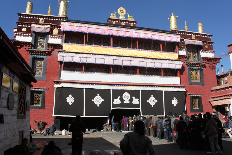 凈室門口兩側(cè)還供有四大天王泥塑像。最后部是佛殿,內(nèi)2柱,無柱礎(chǔ),面積23。5平方米。大柱表面用麻繩纏繞之后又用2~3厘米的泥皮涂抹,可能是防腐、防火的措施。柱頭雕有蓮花寶座,柱頭小栱上則無裝飾,具有明顯的早期特點。四壁的壁畫多為線描盤腿坐形象,筆法流暢生動。大殿的墻壁均用大石塊夾小石片砌成,厚1~1。3米。殿內(nèi)供有尼泊爾墀尊公主帶來的銅鎏金不動金剛佛和八大隨佛弟子泥塑像,以及兩大忿怒力士、宗喀巴塑像。佛殿后部和兩側(cè)還繞以密閉回廓,偏窄、較高,具有早期布局特征。神殿第二層前前為僧舍,中部為大經(jīng)堂天井,天井之后為供佛大殿,6柱,內(nèi)供桑杰魯王甲后、十六尊者及經(jīng)書;里面還有一大殿,8柱,內(nèi)供藥師八如來和《甘珠爾》佛典,北面供奉有救度母及其他佛像。神殿第三層前面為達賴?yán)锏皆撍碌膶S米》?,?間。后部則為金頂?shù)?,殿門向東,面積約54。5平方米,內(nèi)有明柱兩排8根,左右開小窗。殿左右及后部有一周狹窄回廓,以木欄相圍。金頂為漢式風(fēng)格,屬歇山式,以斗栱承托;金頂垂脊末端套有羯摩魚頭,是為套獸。殿內(nèi)門窗壁畫、柱子等則是藏式風(fēng)格,體現(xiàn)了藏漢建筑的巧妙結(jié)合。
