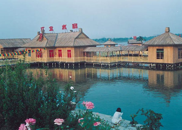 江北水寨位于聊城古城西側(cè),中國(guó)垂釣基地南面,整個(gè)水寨采用竹木結(jié)構(gòu),保留本色,全部建筑浮于湖水碧波之上,總建筑面積640余平方米。