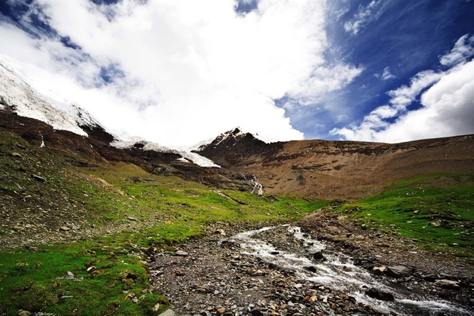 卡若拉冰川位于西藏山南地區(qū)浪卡子縣和江孜縣交界處,距離江孜縣城約71公里, 是西藏三大大陸型冰川之一,為年楚河?xùn)|部源頭。從羊卓雍錯(cuò)出來后,跨越4330米的斯米拉山口后就來到了卡若拉冰川的冰舌下。冰舌前沿海拔5560米,觀看卡若拉冰川的地方海拔約有5400米,在山口北面5600米左右的地帶,屬寧金抗沙峰冰川向南漂移后形成的懸冰川。