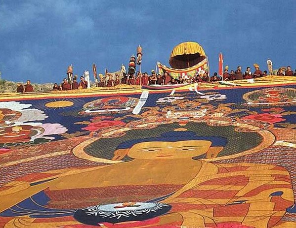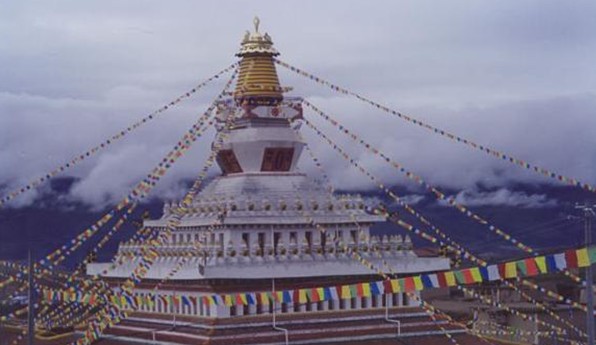 雍仲林寺的重要殿堂通追拉康,位于寺院東北側(cè)。通,意為“見”;追,意為“解脫”。顧名思想朝圣者來到這時(shí),僧人們就會(huì)主動(dòng)給你敬圣水。拉康面積約80平方米,殿內(nèi)供奉的5座靈塔,“文革”時(shí)全部被毀,現(xiàn)已將其中最大的江袞•達(dá)哇堅(jiān)贊塔修復(fù),高達(dá)5米,鑲嵌黃金2公斤。殿內(nèi)一對銀燈和一個(gè)曼荼羅,各用70個(gè)銀元制成。殿內(nèi)繪有壁畫:中央壁上繪有江袞•達(dá)哇堅(jiān)贊畫像;四壁繪有苯教祖師頓巴辛饒的千佛像。