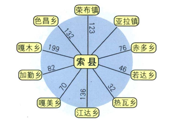 2001年,索縣轄:亞拉鎮(zhèn)、赤多鄉(xiāng)、嘎美鄉(xiāng)、嘎爾木鄉(xiāng)、加勤鄉(xiāng)、江達鄉(xiāng)、榮布鄉(xiāng)、若達鄉(xiāng)、 熱瓦鄉(xiāng)、色昌鄉(xiāng)、永納鄉(xiāng)、亞安鄉(xiāng)。