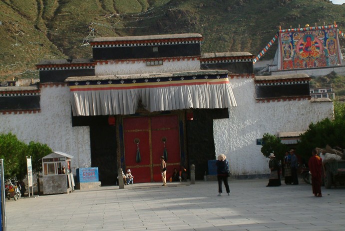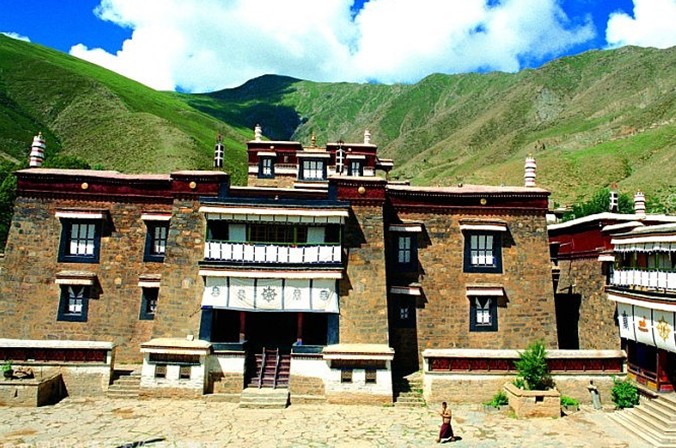 寺院坐西朝東,四面群山環(huán)抱,山清水秀,環(huán)境十分優(yōu)美。面積約10萬(wàn)余平方米,圍墻為多邊形。寺內(nèi)主要建筑為祖拉康佛殿,坐西向東,高三層。底層為大經(jīng)堂,面闊5間,進(jìn)深6間,內(nèi)有20根方柱,其中有兩根高5.5米的林柱通向二層。