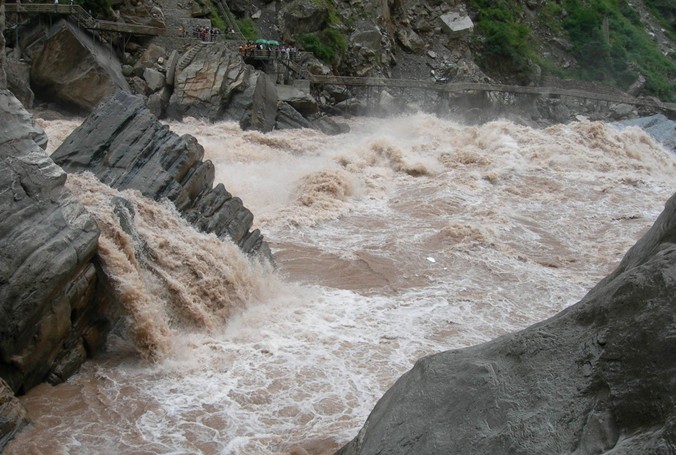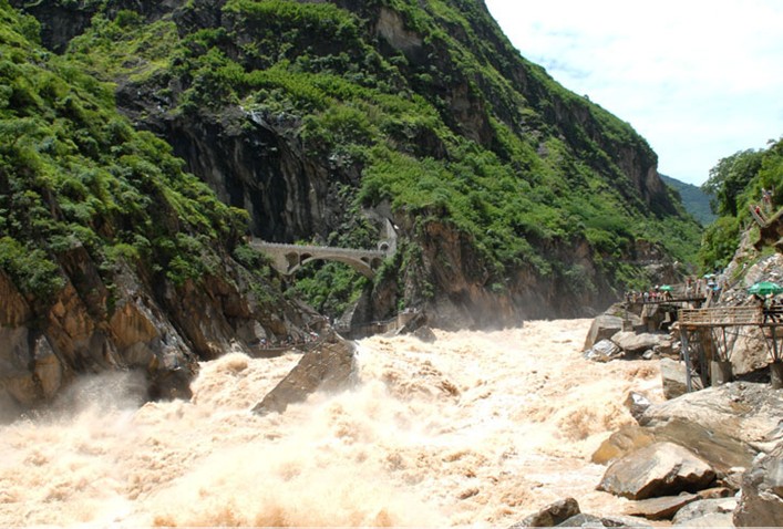 石鼓以下,江面漸窄,至左岸支流碩多崗河口橋頭鎮(zhèn),往東北不遠(yuǎn)即進(jìn)入舉世罕見(jiàn)的虎跳峽?;⑻鴯{上峽口與下峽口相距僅16公里,落差竟達(dá)220米。平均坡降達(dá)13.8‰,是金沙江落差最集中的河段。峽中水面寬處60米,窄處僅30米并有巨石兀立江中,相傳曾有猛虎在此躍江而過(guò),故名虎跳石,虎跳峽也由此得名。峽內(nèi)急流飛瀉、驚濤轟鳴,最大流速達(dá)10米/秒。峽谷右岸為海拔5596米的玉龍雪山,左岸為海拔5396米的哈巴雪山,兩山終年積雪不化。峽內(nèi)江面不足海拔1800米,峰谷間高差達(dá)3000余米。峽中谷坡陡峭,懸崖壁立,呈幼年期“V”型峽谷地貌。
