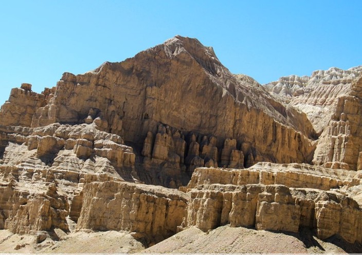 扎達(dá)土林面積達(dá)數(shù)百公里之闊,其地貌在地質(zhì)學(xué)上稱河湖相。專家考證,一百多萬(wàn)年前,扎達(dá)到普蘭之間是個(gè)方圓500多公里的大湖,喜馬拉雅造山運(yùn)動(dòng)使湖盆升高,水位線遞減,逐漸沖磨出“建筑物”惟妙惟肖的形狀與層高,數(shù)十萬(wàn)年風(fēng)雨的侵蝕,猶如神工鬼斧不間斷的雕琢打磨,更使他玲瓏剔透出神入化。