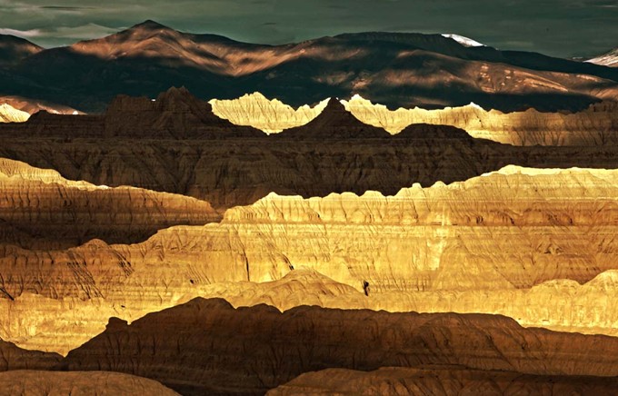 扎達(dá)土林位于這片土林的邊緣,象泉河谷的南側(cè)。日落時(shí)分,寂寥的村落與大地共融一色,仿佛昭示著世界亙古如斯般平靜。然而,在距今大約1100年前,同樣的金色余暉中,佇立著的卻是強(qiáng)盛一時(shí)的古格王國(guó)的輝煌宮殿和宏偉寺院。從現(xiàn)存的殘頹遺址可以想見,當(dāng)時(shí)氣象之盛,場(chǎng)面之巨,遠(yuǎn)非眼前這般光景可比。札不讓,從一個(gè)巍峨的都城到寂寂無(wú)名的小村地名的嬗變,多少令人在感嘆天地造化土林之功以后,又嘆世事滄桑之巨變。