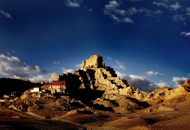 古格王國(guó)是在公元十世紀(jì)前后,由吐蕃王朝末代贊普朗達(dá)瑪?shù)闹貙O吉德尼瑪袞在王朝崩潰后,率領(lǐng)親隨逃往阿里建立起來(lái)的。從它的建立就嗅得出悲情的色彩。這個(gè)王朝投影到現(xiàn)在,變成了阿里扎達(dá)札不讓區(qū)象泉河畔的一座土山,占地約18萬(wàn)平方米,共有屋洞窟300余處、佛塔(高10余米)3座、寺廟4座、殿堂2間、地下暗道2條的遺跡。