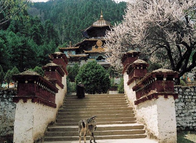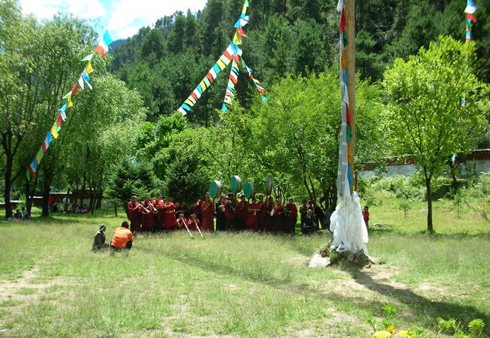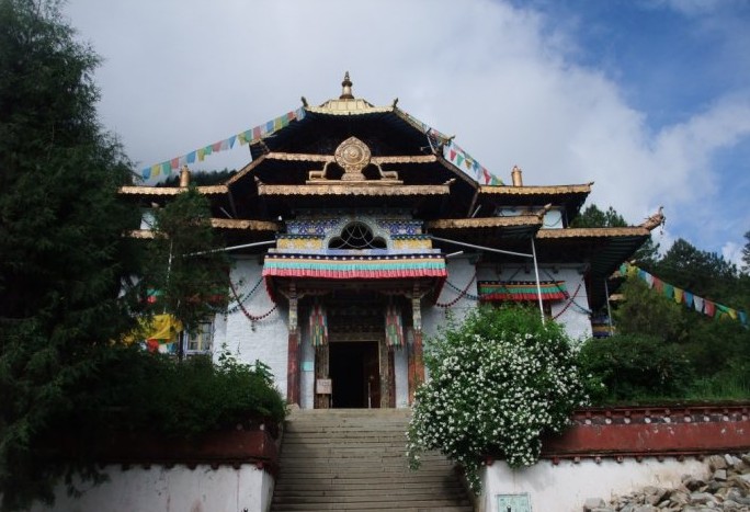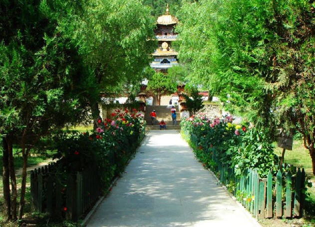 喇嘛嶺寺位于西藏林芝地區(qū)所在地八一鎮(zhèn)東南三十公里處的森林包圍的山坳里。喇嘛嶺寺的金頂與翠綠的松柏交相輝映。寺院經(jīng)堂和僧舍四周,各種顏色的菊花、格?;幭喽菲G,鐃跋聲、鈴鼓聲以及渾厚而又清脆的誦經(jīng)聲回蕩在山谷。這座建于上個世紀三十年代末的古剎,屬藏傳佛教四大教派之一的寧瑪派(俗稱紅教)寺廟。