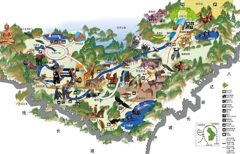 八達嶺野生動物世界設(shè)計建有30處景區(qū)及一個小型水庫,其中包括動物游覽區(qū)20處;古跡游覽區(qū)2處;表演場(館)4處;植物觀賞區(qū)1處;健身運動區(qū)2處。園內(nèi)動物規(guī)模有47種達兩千余只(頭)。