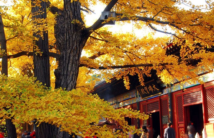 寺內(nèi)有雌雄銀杏,東側(cè)為雌,結(jié)果但不開花;西側(cè)為雄,開花但不結(jié)果,奇特之處在于西側(cè)的雄性銀杏,樹高30米,主干四周,生有十株側(cè)干,據(jù)說自唐代栽了這兩株銀杏以來,每改換一個朝代,就多長出一株側(cè)干,這只是一種傳說,但銀杏的樹齡已在千年以上,則是確切無疑的。大雄寶殿后有“紫藤寄松”,大雄寶殿后面的西側(cè)生長有一株樹齡數(shù)百年的平頂松,樹高6米余,有9個分枝,平直地伸向東側(cè)的四面八方,下面用十余根木料支撐,平頂松附近,有兩株碗口粗的紫藤如龍蛇飛舞一樣繞生在松樹上,形成一個巨大的傘蓋,遮蔭面積400多平方米,每年春末夏初,藤蘿花如串串紫色珍珠一樣,掛滿枝頭,碧綠的松枝與紫色的藤花相繼爭奇斗艷,令游人嘆為觀止。此乃紅螺寺一大景觀。