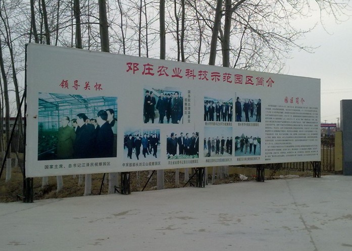 鄧莊農(nóng)業(yè)科技示范園區(qū)始建于1998年6月,占地500畝,建成高級日光溫室150棟,全智能連棟溫室2棟,并建成工廠化育苗中心、無公害檢測中心、組織培養(yǎng)中心、肉奶牛胚胎移植中心、技術(shù)人才培訓(xùn)中心、凈菜加工配送中心六個(gè)中心。2001年,鄧莊園區(qū)被認(rèn)定為省級農(nóng)業(yè)科技示范園區(qū)、河北省無公害蔬菜生產(chǎn)基地、河北省進(jìn)京蔬菜生產(chǎn)供應(yīng)基地。
