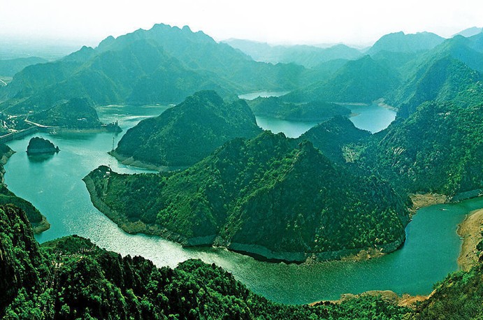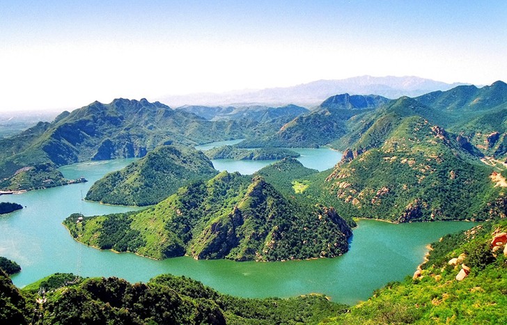 燕塞湖環(huán)繞在深山峽谷之中,延伸三十華里,沿岸懸崖峭壁千姿百態(tài)、 惟妙惟肖,自然景觀星羅棋布,蒼松翠柏、野杏山桃,映入水中如翠如碧,蘊盡詩情畫意,素有北方“小桂林”、 “小三峽”之美稱。