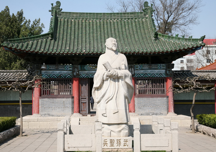 孫武祠位于廣饒縣城西北隅,占地面積8萬平方米,與廣饒關(guān)帝廟大殿毗連,由4個相互通連的仿宋式建筑組成。院內(nèi)有一壁刻,書有確認孫武故里—齊國樂安就是現(xiàn)在廣饒的《史記》、《資治通鑒》等史書文獻的記載和若干考證。院正中是高3米,一手拿竹簡,一手持寶劍的孫武的石雕像,正殿內(nèi)有孫武伏案疾書的銅像,身后是展現(xiàn)《孫子兵法》精彩場景的大型壁畫。