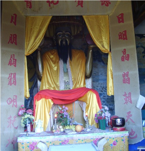 地處河北省滄州市北的青縣城南6公里有村曰“大盤古”,村西有座盤古廟。盤古廟始建于元世祖至元十五年(1278年),明弘治和崇禎年間曾重修,清康熙二十七年(1688年)因河流沖刷,設(shè)于秋祠西南重建,均有碑記。據(jù)文獻(xiàn)記載和民間傳說,當(dāng)年的盤古廟狀似北京的故宮三殿,石、磚、木結(jié)構(gòu),琉璃瓦蓋頂,金碧輝煌,蔚為壯觀。前殿高三丈六尺,象征一年360天;臺(tái)階18級,為18層地獄之說;飛檐椽子108根,按36天罡、72地煞而布;每根椽頭系銅鈴一枚,照工、商、角、征、羽五音而置,有所謂“風(fēng)搖鈴響天動(dòng)樂,光照殿頂?shù)厣x”之說。殿內(nèi)有身披樹葉,手托日月的鐵鑄涂金盤古像,高一丈零八寸。中殿塑有南海觀音像,股坐蓮盆,金童玉女立兩側(cè)。版權(quán)所有山東聊城聊之旅國際旅行社有限公司,轉(zhuǎn)載必究!后殿設(shè)老君、孔子、龍王三塑像,殿前有合抱粗的合歡樹兩株,殿后鐵磬懸于古槐。可惜盤古廟在1947年毀于戰(zhàn)火。九十年代,當(dāng)?shù)厝罕娊M織起來修復(fù)盤古勝跡,以滿足來此朝圣拜祖的人流尋訪。