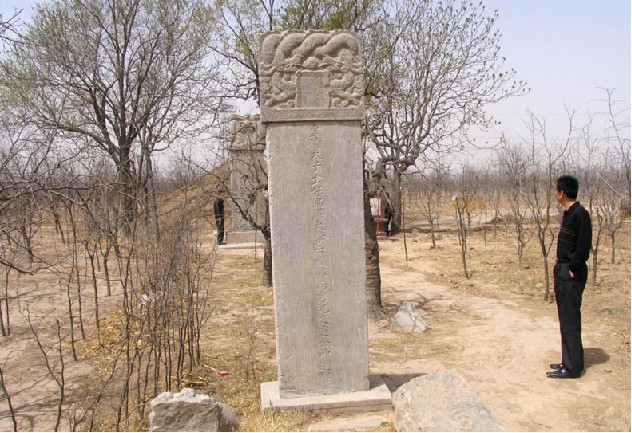 墓碑原地現(xiàn)墳丘東21米處,碑下基石上,有一片石灰混合土夯實(shí)地基,上鋪198×82厘米的兩塊青石板。現(xiàn)尚存一塊,1989年修復(fù)墓地時(shí)鋪于墓碑之下。墓石合二為一,周邊有雕花。其上是一個(gè)巨型赑屃(石龜),已毀。從基石上還可看出石龜?shù)淖?。爪間距離前后爪距160厘米,左右爪距120厘米。赑屃背馱墓碑,碑冠已毀。從碑座到碑冠,整個(gè)墓碑通高5米左右。
