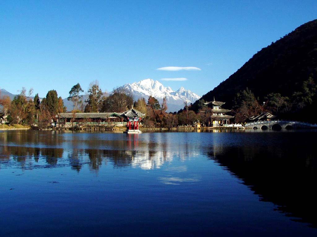 黑龍?zhí)豆珗@位于昆明北郊的龍泉山五老峰下,(亦稱龍泉山麓,太極山、五老山), 昆明黑龍?zhí)墩嫉孛娣e91.4公頃,距離市區(qū)約17公里。這里古木參天,泉壑幽邃,修竹茂林,潭深水碧,景色幽深。民間傳說有黑龍王潛藏于此,故稱黑龍?zhí)兑喾Q龍泉山麓,距離市區(qū)約17公里。黑龍?zhí)秲?nèi)有罕見的大型梅園,是昆明的賞梅勝地,稱為“龍泉探梅”。園內(nèi)的“唐梅”相傳由南詔移植過來,同安寧漕溪寺的“元梅”被認為是云南最珍貴的古梅。在黑龍?zhí)秲?nèi)還有這樣的奇怪現(xiàn)象,潭以中間的石橋為界一分為二,一清一濁,清濁之水互不相融,據(jù)說連魚兒都互不過界,頗為神奇。黑龍?zhí)妒怯忻牡澜虅俚?,分為上下兩觀,從漢代的黑水祠演變而來。上觀始建于唐宋時期,始稱龍泉觀,下觀始建于明代,俗稱黑水宮。1997年,黑龍?zhí)队斡[區(qū)占地3.6公頃。1999年,黑龍?zhí)队酗L(fēng)景林51.4公頃,植有各種喬灌木12萬多株。梅園28.5公頃,地栽梅5794株,盆栽梅1725盆。庭園占地6.9公頃,有喬木3973株,灌木48660株,修竹306叢。 1978年建苗圃,占地5.6公頃。建有杜鵑谷,植各種杜鵑10萬多株。1998年又新辟一期綠化工程,占地33公頃,游覽區(qū)擴大到45.4公頃。園內(nèi)有昆明市綠化委員會掛牌保護的古樹名木18株,是昆明市存有古樹名木最多的風(fēng)景名勝區(qū)。麗江黑龍?zhí)妒冀ㄓ谇《辏?737),其后乾隆六十年、光緒十八年均有重修記載。舊名玉泉龍王廟,因獲清嘉慶、光緒兩朝皇帝敕封“龍神”而得名,后改稱黑龍?zhí)?。詩云?ldquo;泉渙渙兮漣漪,問何時最是可人?須領(lǐng)略月到天心,風(fēng)來水面;亭標標而矗立,看這般無窮深致,應(yīng)記取云飛畫棟,雨卷珠簾。”黑龍?zhí)兑云涮焐愘|(zhì),名列《中國名泉》、《中國風(fēng)景名勝》等書,誠不虛也。迎面見有一座涂金繪彩的牌樓,門口四尊石獅,肌理秀美,威武雄壯,過去守護木氏土司衙門,1966年遷此守護玉泉。進門往右,但見垂柳飄指,一潭澄碧,樹底天光云影,樹梢樓臺隱現(xiàn)。沿潭右堤至鎖翠橋,橋上古人有聯(lián)云:“驚濤撼樹飛晴雪,未雨垂虹臥曲波。”它生動地描繪了橋邊景致。右邊橋下三孔飛瀑,水花四濺,上觀景區(qū)濤聲如雷,流向古城,玉水河畔,楊柳依依,濃蔭蔽日。往橋的左邊看,一座五孔石拱橋,長虹臥波一般,將潭一分為二,玲瓏俊美的一文亭、得月樓分別屹立內(nèi)外潭心,四面臨水,有橋與岸上相連。此樓始建于清光緒二年(1876年),樓名取自古人對聯(lián)“近水樓臺先得月、向陽花木早逢春”中三字。1963年重建時,郭沫若為該樓題寫了匾額“得月樓”三字及兩[1]副對聯(lián)。一副是集毛澤東詩詞句:春風(fēng)楊柳萬千條,風(fēng)景這邊獨好;飛起玉龍三百萬,江山如此多嬌。另一副是郭老撰書的楹聯(lián):龍?zhí)兜褂呈?,潛龍在天,飛龍在地;玉水縱橫半里許,墨玉為體,蒼玉為神。全聯(lián)僅三十字,卻寫出了麗江黑龍?zhí)兜纳耥崳瑫ㄥ賱哦鵀⒚摫挤?,為公園增色不少。遠處玉龍雪山倒遇潭中,可見“雪山四萬八千丈,銀屏一角深插底”奇景。象山半壁也映入水中,使黑龍?zhí)渡街杏兴?,水中有山,山水相映,景色無比秀麗。